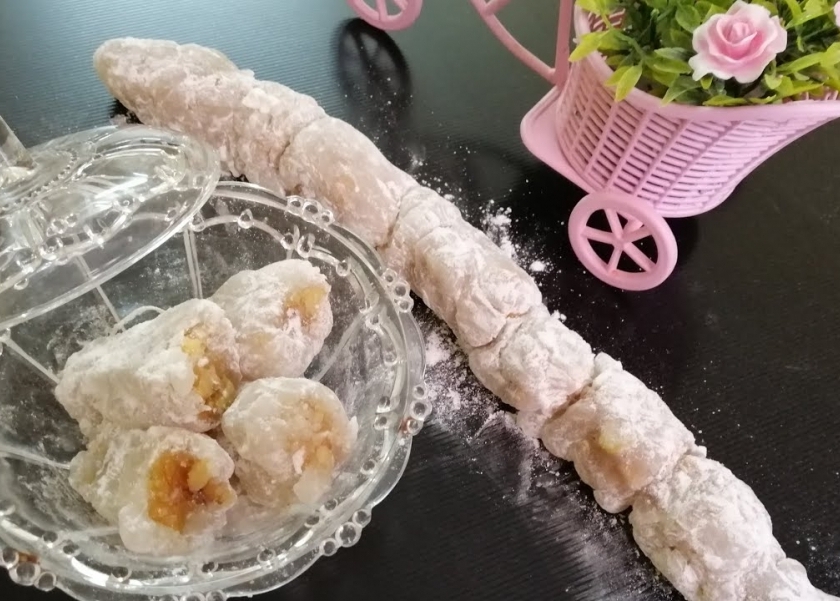 - ويصب الخليط في صينية مدهونة سكر بودرة، ويغطي بسكر بودرة ويوضع ليلة فى الثلاجة ثم يقطع ويقدم، ومن الممكن إضافة نقطة من أي لون مفضَّل على الوصفة.