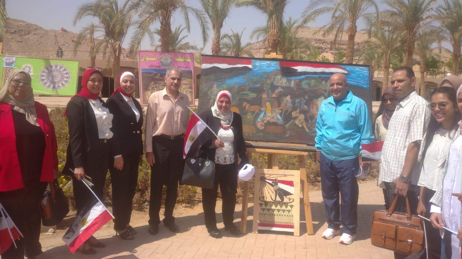 وقال الدكتور أيمن عثمان رئيس جامعة أسوان إن مشاركة كلية الآثار جاء في إطار الاحتفال بانتصارات ٦ أكتوبر المجيدة، التي تنظمها محافظة أسوان بالتعاون مع جامعة أسوان، في هذا الإطار دشنت أيضا كلية الآثار معرضا فنيا يضم لوحات كلية الآثار بالمسرح الروماني بأسوان على هامش بطولة الصعيد للسباحة في المياه المفتوحة التابعة لمنطقة الصعيد للسباحة المقامة تحت رعاية الدكتور أيمن عاشور وزير التعليم العالي والبحث العلمي، وبالتعاون مع وزارة الشباب والرياضة وتحت رعاية اللواء أشرف عطية محافظ أسوان.