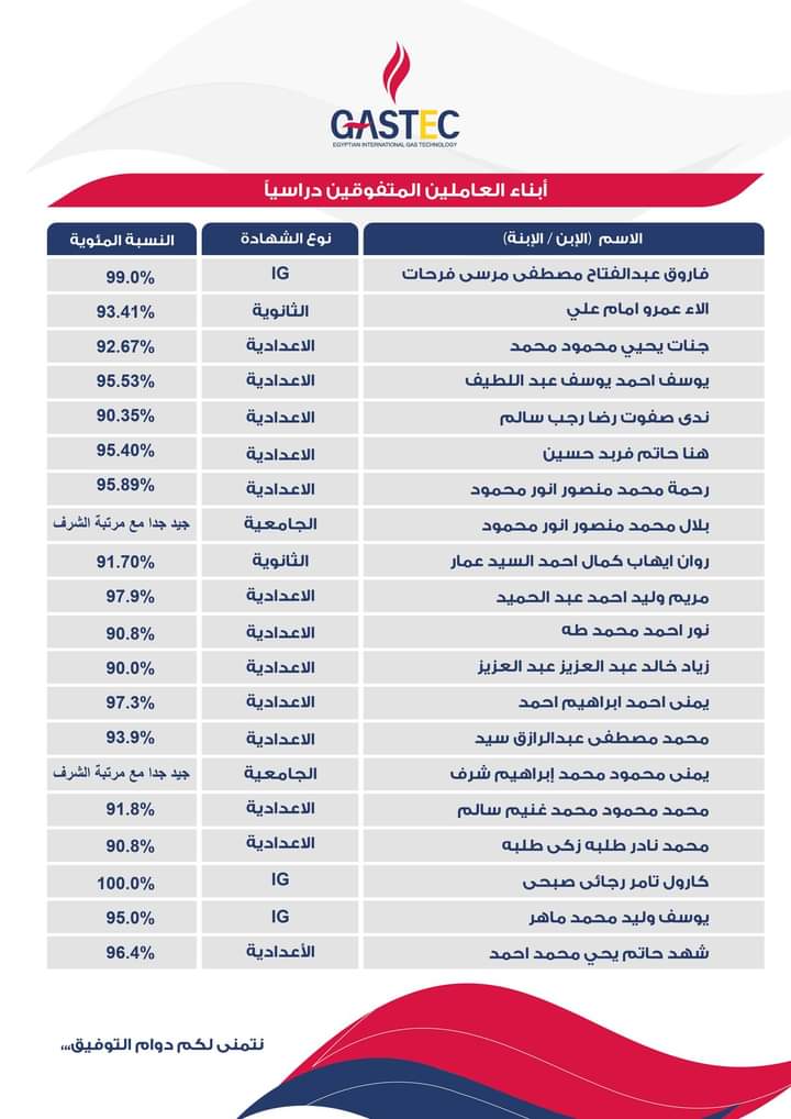 كما أعرب رئيس غاز تك عن تقديره واعتزازه بالطلبة المتفوقين باعتبارهم نماذج مشرفة وأمل مصر وسبيلها للحاق بركب التقدم العلمي والتطور التكنولوجي الذي يشهده العالم في كافة المجالات، وطالبهم ببذل المزيد من الاجتهاد والتفوق من أجل تقدم وازدهار وطننا الحبيب خاصة في ضوء تزامن حفل التكريم باحتفال مصر بأعياد أكتوبر المجيدة وانتصارها العظيم بأيدى أبنائها المخلصين.
