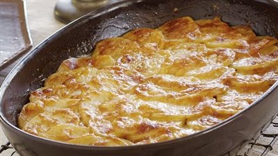 تسكب الكريمة المحضرة فوق المكونات السابقة، ثم تغطى الصينية بالفويل وتخبز في فرن حار، تم تسخينه مسبقا، مدة ٣٠ دقيقة.