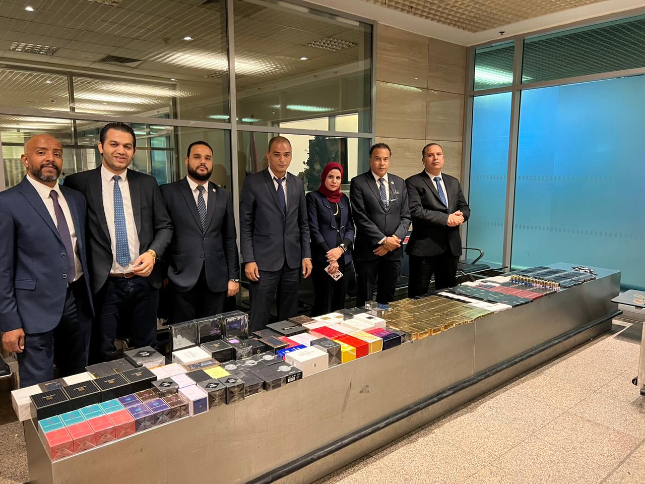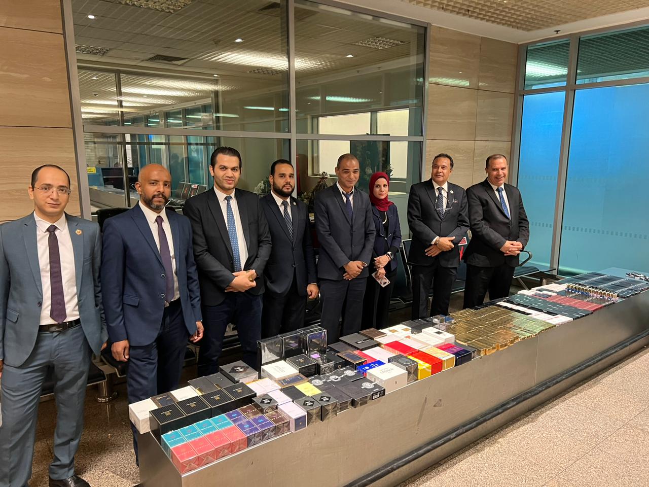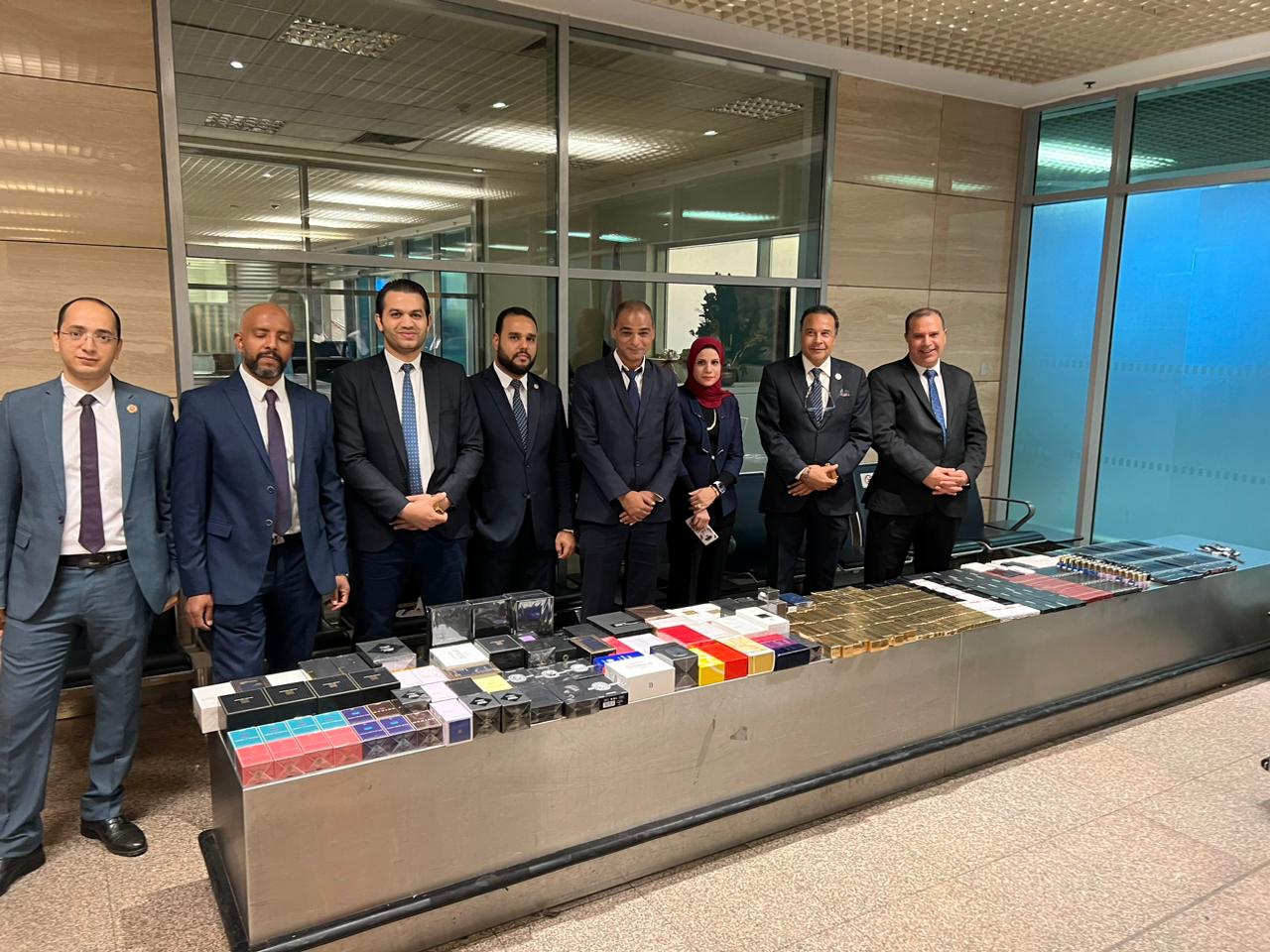 وبالعرض علي احمد فؤاد الدلهماوي مدير الإدارة بالانابة قام بتشكيل لجنة مكونة من أحمد عطا الله وحسن مختار وطالسيد موسي وفاطمه عبده واحمد مرسي وشريف عيد مأمير الجمرك تحت اشراف احمد فتحي مدير الحركة بجرد وعد وتصنيف وتحريز المضبوطات والتي بلغت ٧٧٢ عبوة مستحضرات التجميل والعطور غالية الثمن.