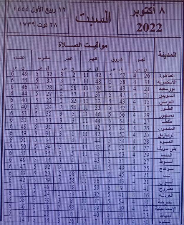مواقيت الصلاة اليوم وفقًا للتوقيت المحلي لمدينتي القاهرة والإسكندرية وعدد من مدن ومحافظات الجمهورية من واقع بيانات الهيئة العامة للمساحة: