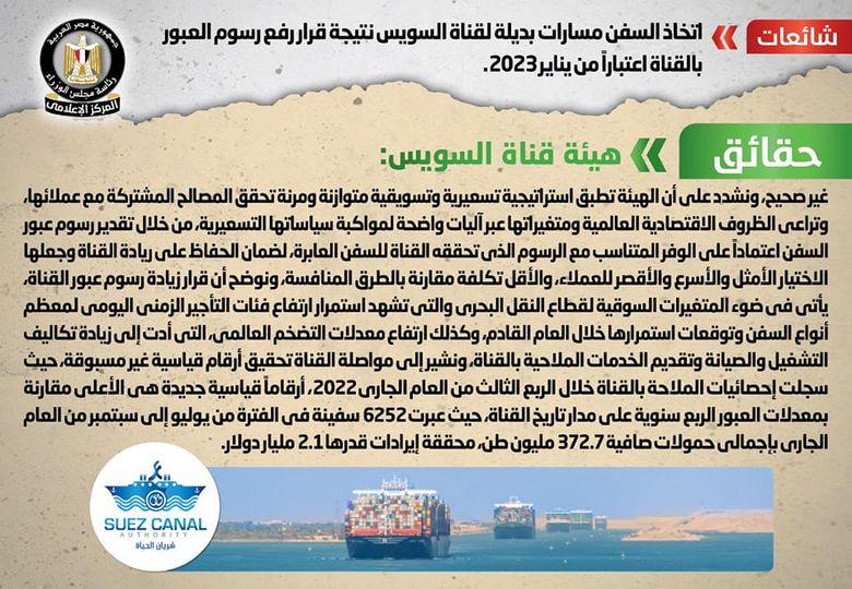 كشف المركز الإعلامي لمجلس الوزراء حقيقة ما يتم تداوله بعض المواقع الإلكترونية وصفحات التواصل الاجتماعي أنباء بشأن اتخاذ السفن مسارات بديلة لقناة السويس نتيجة قرار رفع رسوم العبور بالقناة اعتبارًا من يناير 2023.