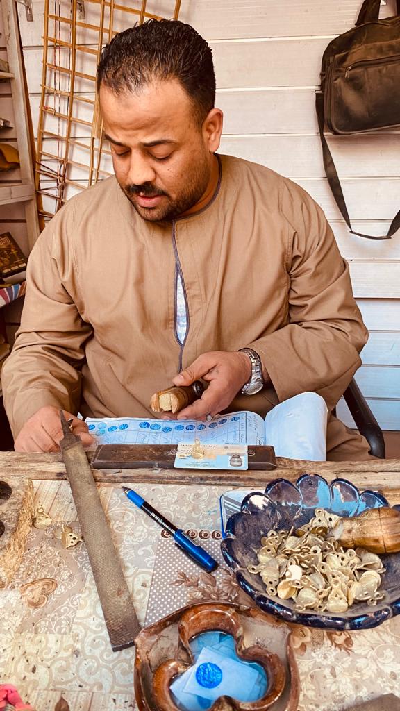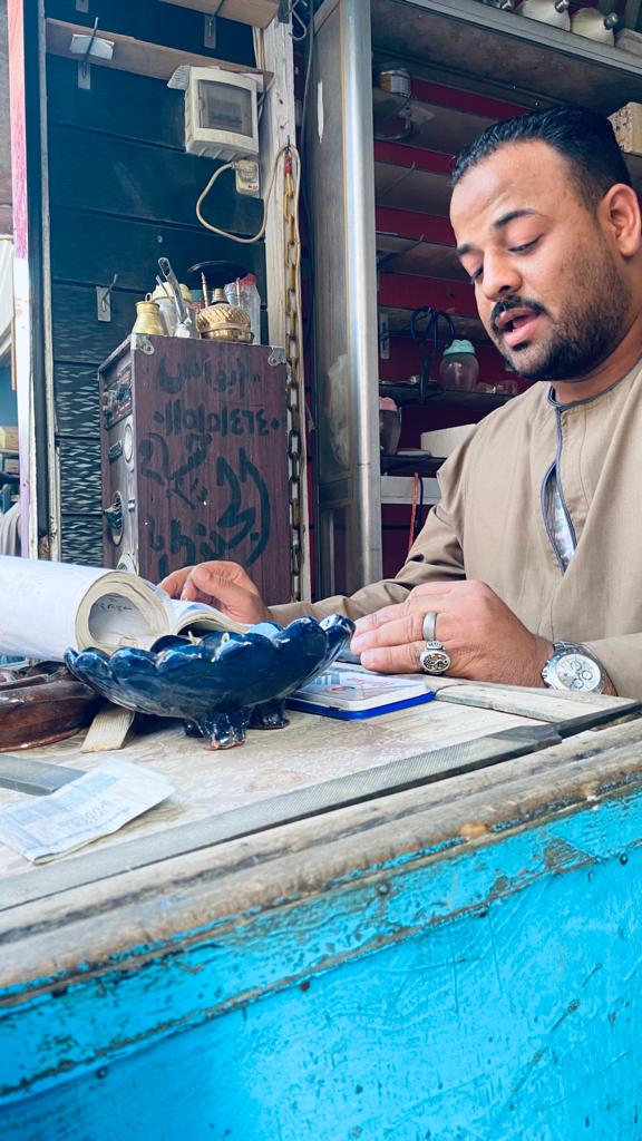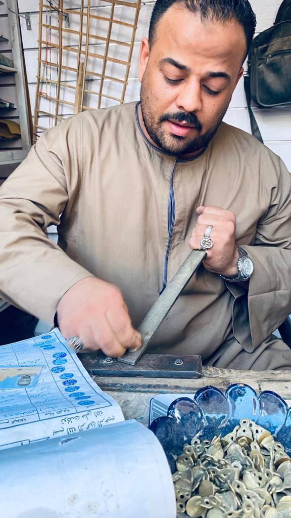 يجلس «حسام الجندي»، ذاك الشاب الأربعيني، وأمامه مكتب تعتليه "عدة الشغل" المكونة من المبرد الحدادى وأقلام الحفر والأختام النحاس المختلفة الأحجام والأشكال.