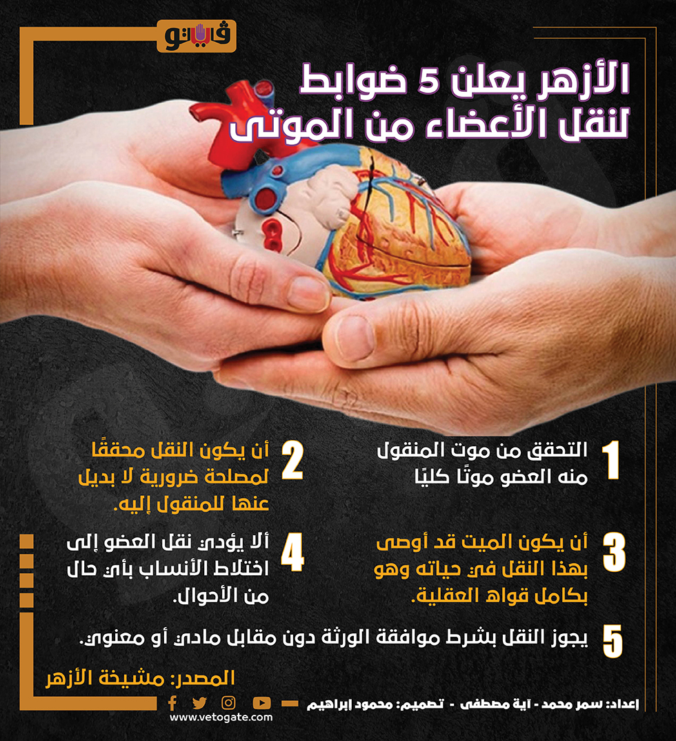 الأزهر يعلن 5 ضوابط لنقل الأعضاء من الموتى | إنفوجراف السبت 08/أكتوبر/2022 - 08:57 م 10/8/2022 8:57:05 PM نقل الأعضاء سمر محمد - آية مصطفى شارك طباعة 18 حجم الخط شارك طباعة شيخ الأزهر نقل الأعضاء من الميت إلى الحي نقل الاعضاء