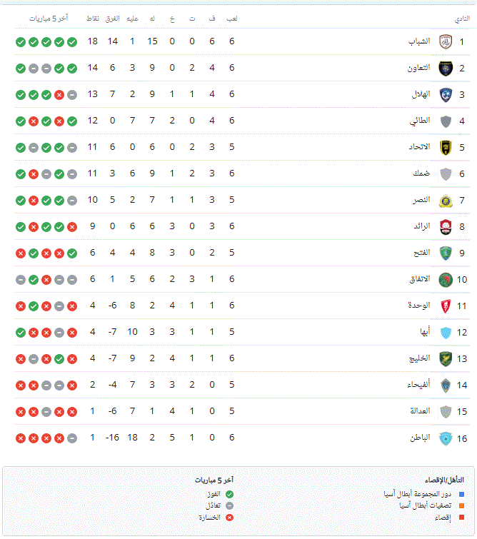 وجاء ترتيب الدوري السعودي قبل ختام الجولة السادسة اليوم كالتالي: