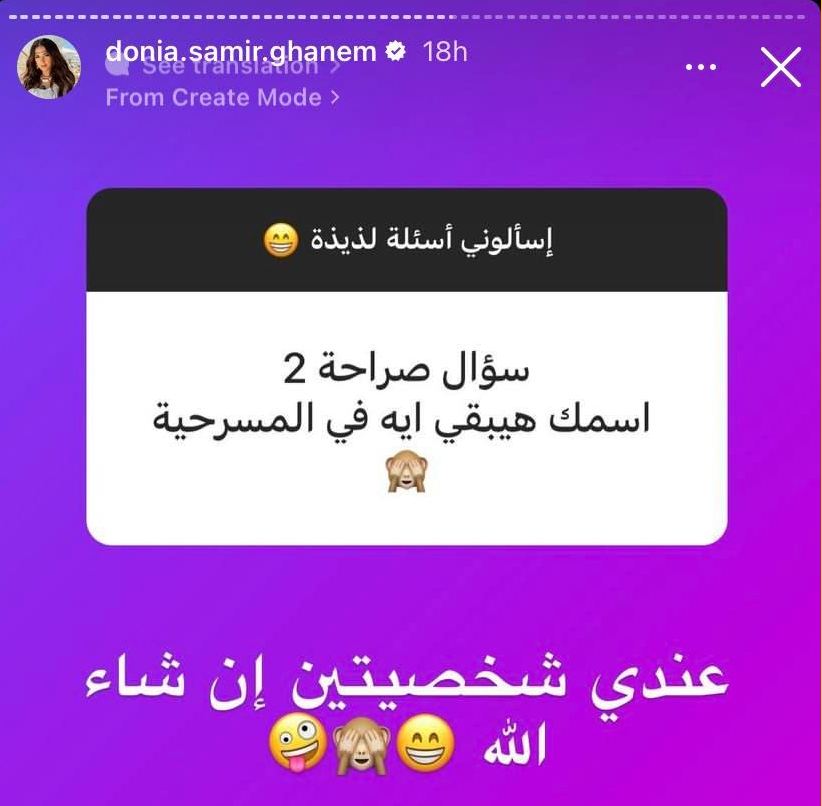 وردت دنيا سمير غانم على سؤال متابع لها على موقع الصور "انستجرام"، عن اسمها في المسرحية قائلة: "عندي شخصيتين إن شاء الله".