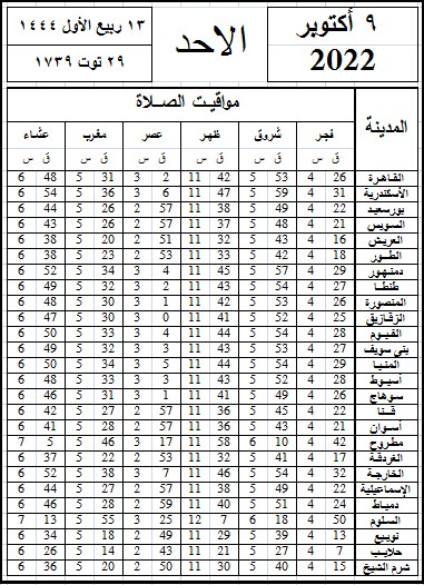 مواقيت الصلاة اليوم وفقًا للتوقيت المحلي لمدينتي القاهرة والإسكندرية وعدد من مدن ومحافظات الجمهورية من واقع بيانات الهيئة العامة للمساحة: