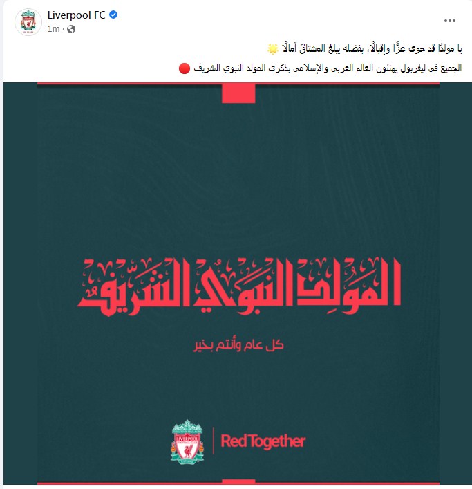 وكتب نادي ليفربول في تدوينة عبر حسابه الرسمية بالفيس بوك "يا مولدًا قد حوى عزًّا وإقبالًا، بفضله يبلغ المشتاقُ آمالًا".