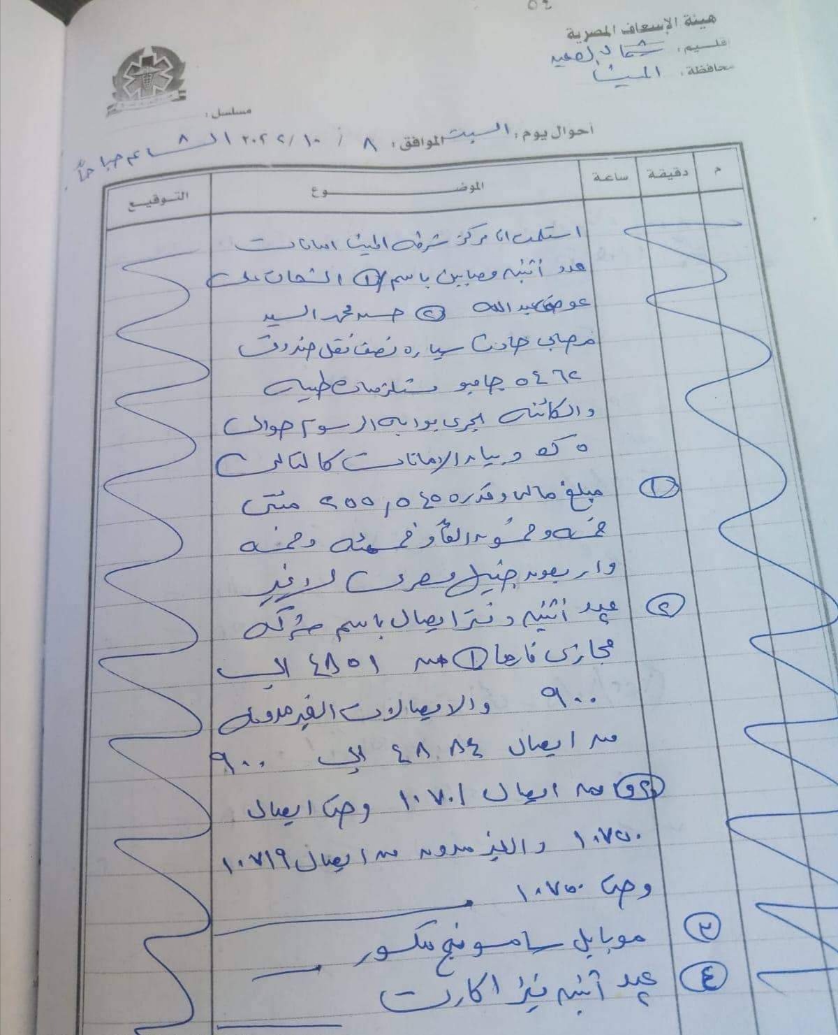 وعلى الفور تم إسعاف المصابين وتقديم كافة الرعاية الصحية لهم، وتم العثور على 250 ألفا و545 جنيها وتم تسليمها بمحضر شرطة بمركز شرطة المنيا.