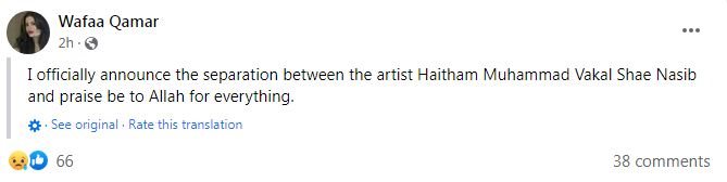 وكتبت وفاء قمر قائلة: "أعلن رسميا الانفصال عن الفنان هيثم محمد.. كل شيء نصيب.. والحمد لله على كل حال".