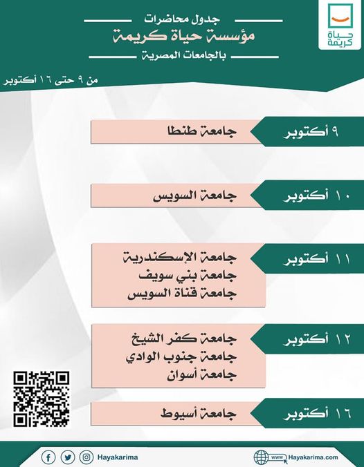 وننشر جدول محاضرات مؤسسة حياة كريمة بالجامعات المصرية وذلك في اطار سلسلة من الندوات التوعوية للتعريف بالجهود التنموية والشبابية ضمن المبادرة الرئاسية حياة كريمة لنشر قيم العمل التطوعي والخدمة المجتمعية لدي شباب الجامعات.