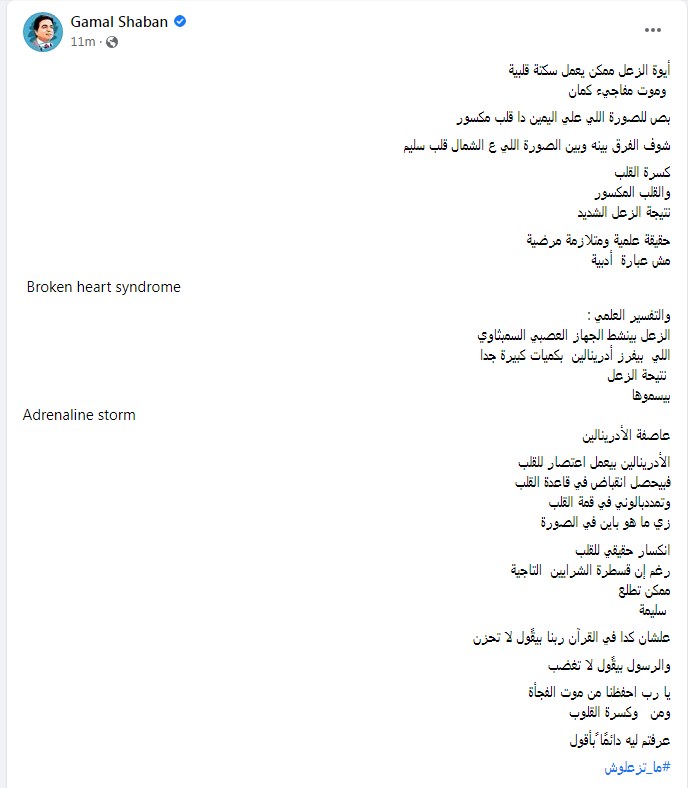 وكتب الدكتور جمال شعبان، في تدوينة له بالفيس بوك، عن ارتباط الحزن و"الزعل" بالأزمة القلبية وانكسار القلب "أيوة الزعل ممكن يعمل سكتة قلبية وموت مفاجيء كمان.. بص للصورة اللي علي اليمين دا قلب مكسور.. شوف الفرق بينه وبين الصورة اللي ع الشمال قلب سليم"