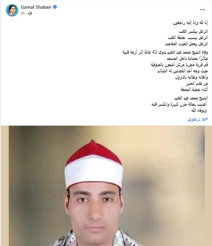 وكتب جمال شعبان في تدوينة سابق عن ارتباط الحزن والزعل الذي تعرض له إمام مسجد بالمنوفية بالموت المفاجئ فقال: " إنا لله وإنا إليه راجعون.. الزعل بيكسر القلب.. الزعل بيسبب جلطة القلب.. الزعل بيعمل الموت المفاجئ.. وفاة الشيخ محمد عبد العليم بدوى 42 عامًا إثر أزمة قلبية متأثرًا بمشادة داخل المسجد في قرية مجريا مركز أشمون بالمنوفية.. حيث وجه أحد المُصلين له الشتائم وأهانه وطالبه بالنزول من على المنبر أثناء خطبة الجمعة.. الشيخ محمد عيد العليم أصيب بحالة حزن كبيرة وانكسر قلبه وتوفاه الله"