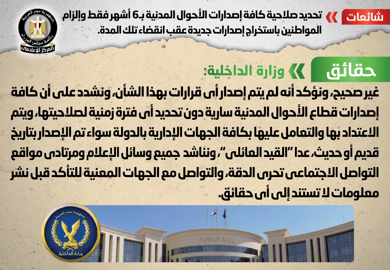 وتواصل المركز الإعلامي لمجلس الوزراء مع وزارة الداخلية، والتي نفت تلك الأنباء، مُؤكدةً أنه لا صحة لتحديد مدة صلاحية لكافة إصدارات الأحوال المدنية أو إلزام المواطنين باستخراج إصدارات جديدة عقب انقضاء تلك المدة، وأنه لم يتم إصدار أي قرارات بهذا الشأن.