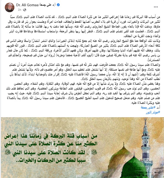 وكتب الدكتور علي جمعة تدوينة على الفيس بوك "من أسباب قلة البركة في زماننا هذا إعراض الكثير منا عن كثرة الصلاة على النبي، ﷺ، لقد كانت الصلاة على النبي، ﷺ، سببًا لكثير من البركات والخيرات، فورد أن قرية في بلاد المغرب أصابها القحط والجفاف، فجاءت امرأة وجلست بجوار بئر قد غارت وقل ماؤها، ودعت الله فإذا بالماء يفور، فجاءها الشيخ الجازولي رضي الله عنه، وسألها عما دعت به ربها. فقالت: ما سألته إلا بالصلاة على النبي ﷺ، فجلست عند القبر تصلي على النبي ﷺ، فنظر إليها ربها بنظر الرحمة، واستجاب استسقاءها ودعاءها ففارت البئر والماء ونجت القرية من الجفاف."