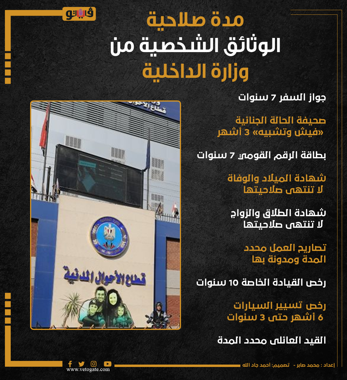 مدة صلاحية الوثائق الشخصية من وزارة الداخلية| إنفوجراف الأربعاء 12/أكتوبر/2022 - 01:13 م 10/12/2022 1:13:21 PM وثائق الأحوال المدنية محمد صابر شارك طباعة 18 حجم الخط شارك طباعة بطاقة الرقم القومى تصاريح العمل القيد العائلي شهادة الميلاد صحيفة الحالة الجنائية وزارة الداخلية أخبار الحوادث الحوادث اليوم