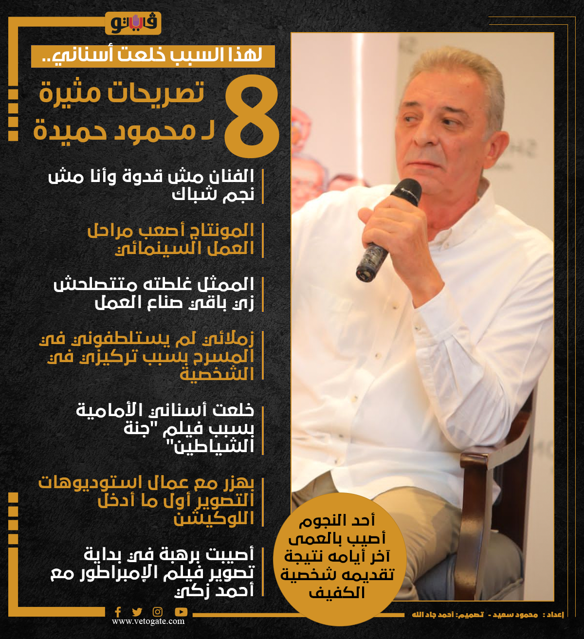 لهذا السبب خلعت أسناني.. 8 تصريحات مثيرة لـ محمود حميدة | إنفو جراف الأحد 09/أكتوبر/2022 - 07:46 م 10/9/2022 7:46:09 PM محمود حميدة محمود سعيد شارك طباعة 18 حجم الخط شارك طباعة محمود حميدة الفنان محمود حميدة مهرجان الإسكندرية السينمائي الاسكندرية السينمائي