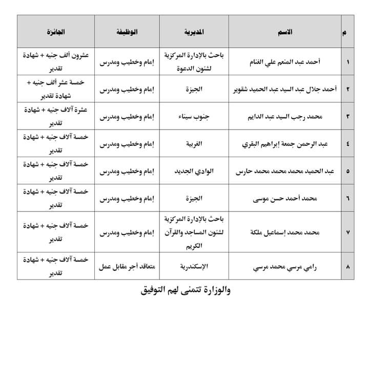 أعلنت وزارة الأوقاف أسماء الناجحين من المتقدمين في مسابقة الخطيب المثالي لعام 2022م وجائزة كل منهم، ونبهت على الحضور يوم السبت الموافق15/10/2022م ؛ لتسلم شهادات التقدير ، وهم: