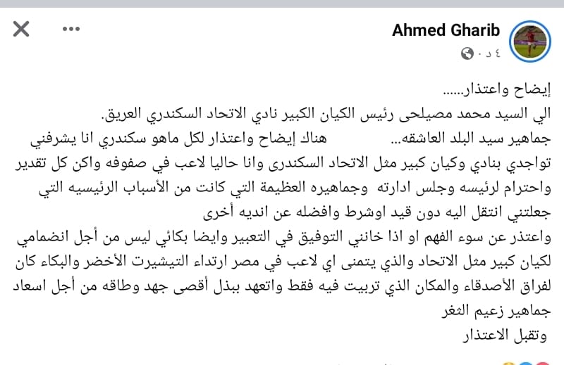 ونشر اللاعب رسالة مؤثرة عبر حسابه على “فيسبوك” قائلا: "إيضاح واعتذار.. الي محمد مصيلحى رئيس الكيان الكبير نادي الاتحاد السكندري العريق..