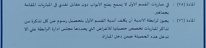 وتضمنت اللائحة الجديدة التي اعتمدتها رابطة الأندية استعدادا للموسم الجديد 2022 – 2023، بندا يمنحها الحق في تكليف أندية الدوري الممتاز بفرض رسوم على كل تذكرة في مباريات الدوري الممتاز، وفقا لنص المادة المادة (76) من اللائحة، تخصص لصالح الرابطة، على ألا تدخل هذه الحصيلة ضمن دخل المباراة.