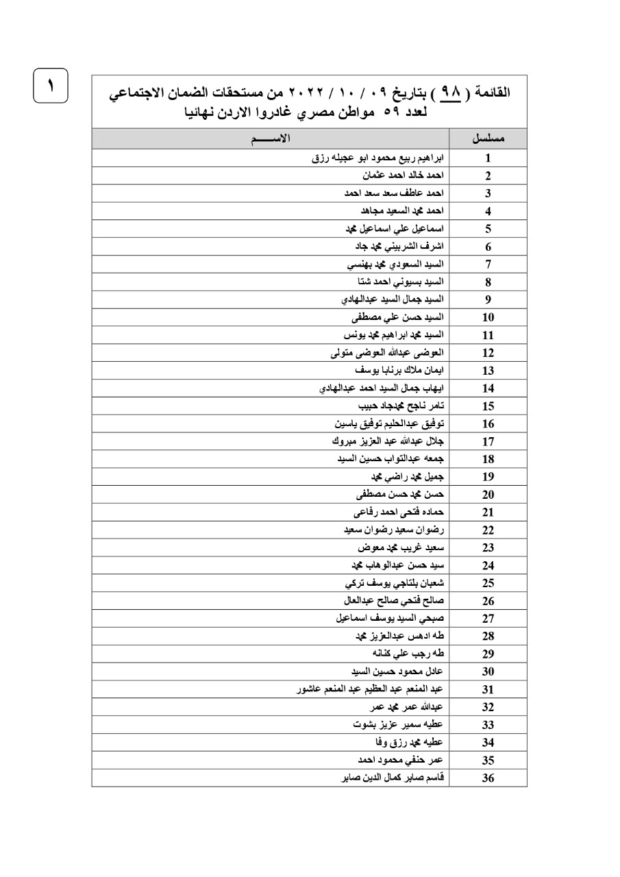وأضاف الملحق العمالي أنه طبقا لإجراءات المؤسسة العامة للضمان الاجتماعي بالأردن، سيتم استرجاع المبالغ غير المصروفة بعد مرور 50 يوما من تاريخ الإعلان عن تحويل المستحقات، مشيرا إلى أنه يتم بشكل مستمر التنسيق والتجهيز لإرسال باقي الدفعات لمستحقيها تباعا، فور تدقيقها من الجهات المعنية حفاظا على حقوق المواطنين المستحقين لهذه الدفعات، وتضم القائمة الجديدة الأسماء المرفقة مع هذا البيان: