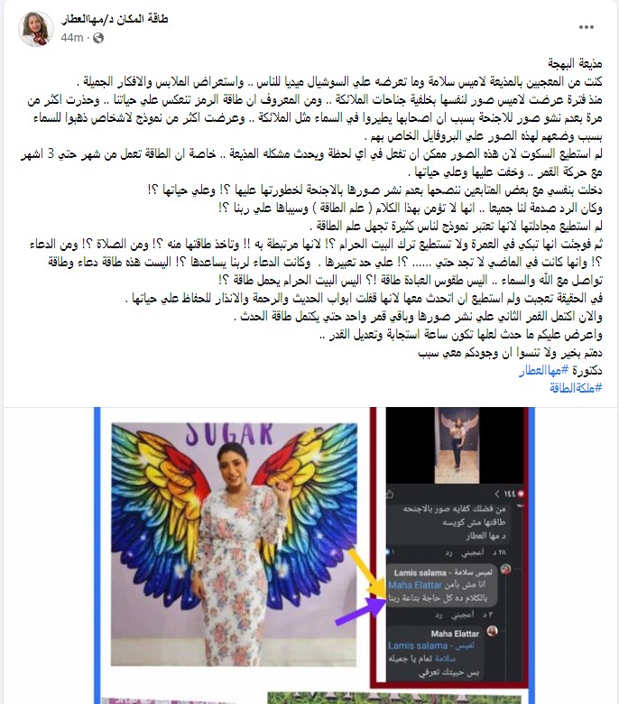 وقالت مها العطار إنها لم تستطع السكوت على وضع المذيعة لصورها بخلفية الأجنحة على بروفايل صفحتها بموقع التواصل الاجتماعي "فيس بوك"، ونبهت المذيعة إلى أن الطاقة تعمل من شهر حتي 3 أشهر مع حركة القمر، وقالت: "خفت عليها وعلي حياتها".