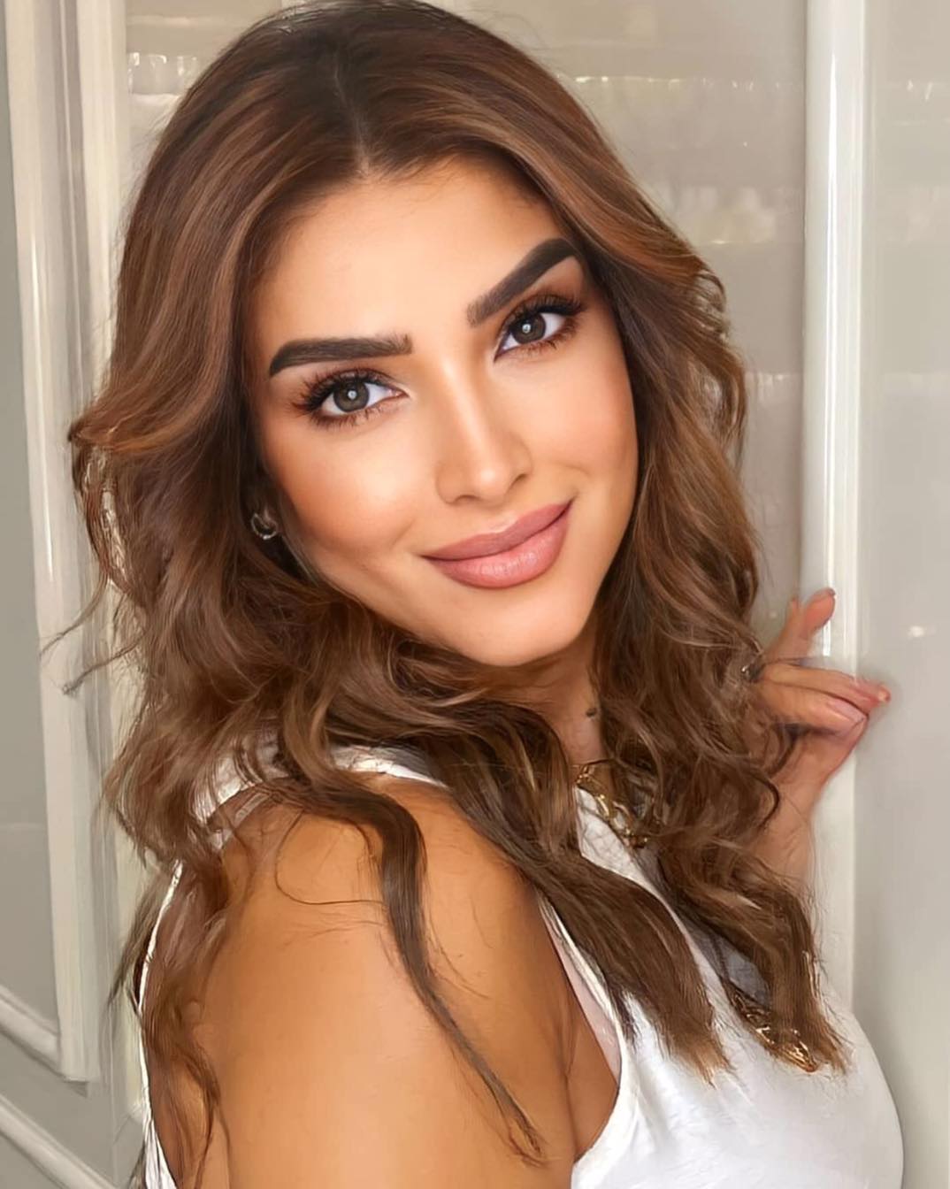 واعتمدت روجينا تسريحة شعر بسيطة بشعر بني إذ تركت شعرها الناعم منسدلًا على كتفيها.