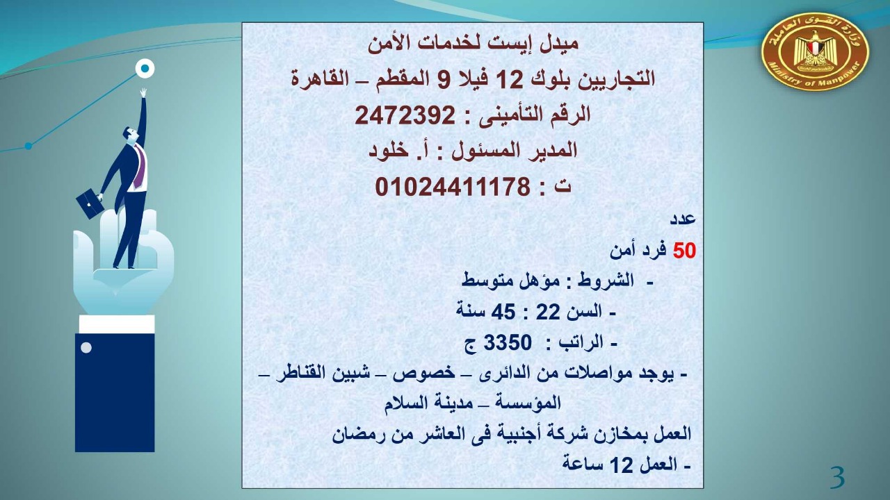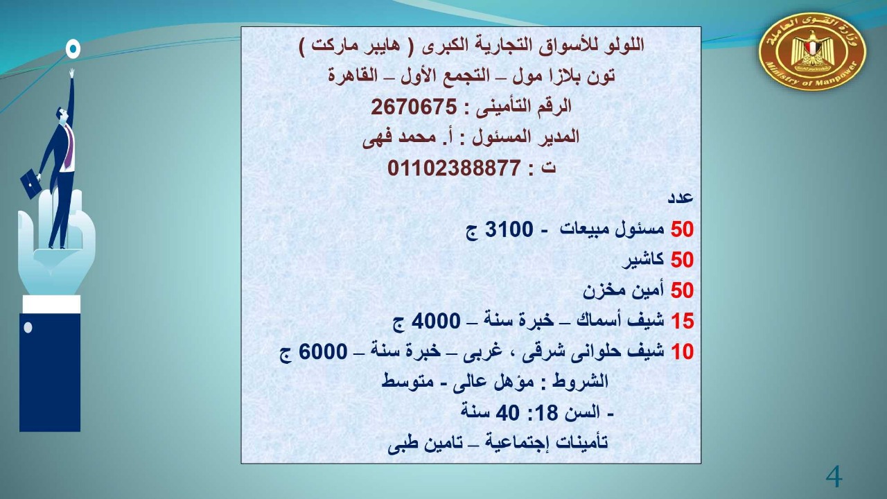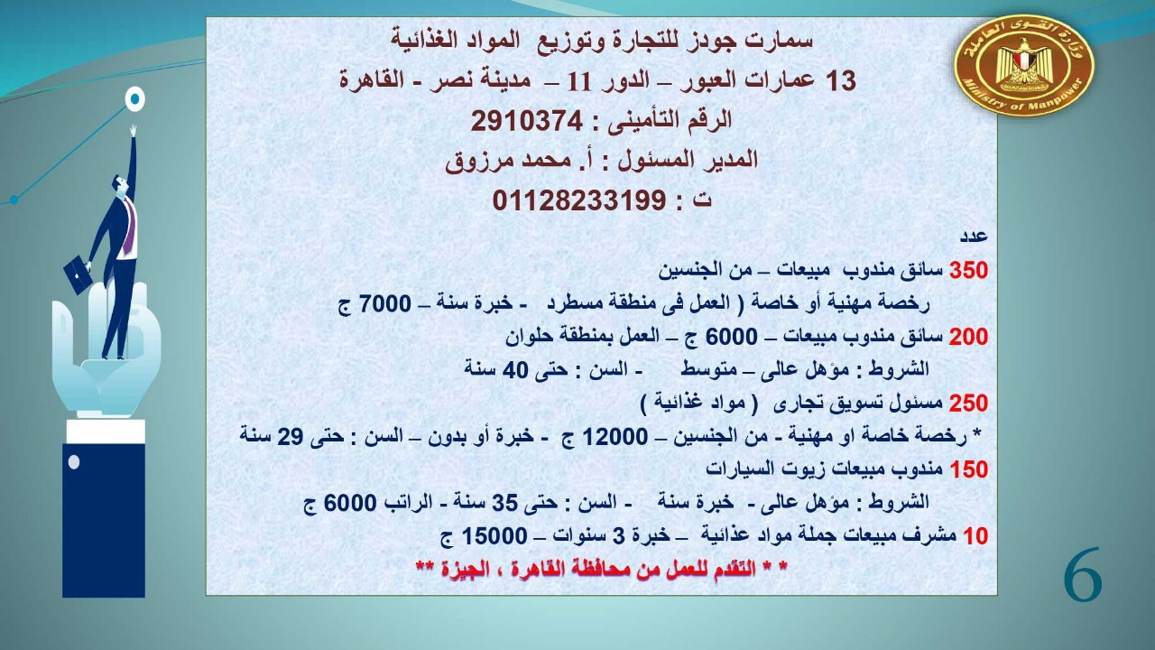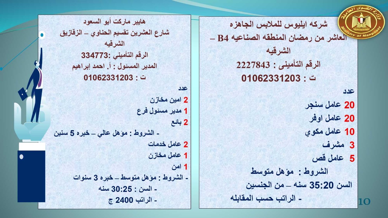 وأعلنت نشرة التوظيف النصف شهرية التي تصدر عن "الوزارة"، عن فرص عمل جديدة،متوفرة في 11 محافظة،هي: القاهرة، الجيزة، الشرقية، المنوفية، البحيرة، دمياط، بورسعيد، جنوب سيناء، الوادي الجيدد، قنا، أسوان..وفي التخصصات الأتية: مهندسين، ومشرفين، ومدرسين، ومندوبين مبيعات، وسائقين، وعمال تفصيل وحياكة بكافة تخصصاتها، ومهن فنية، وإدارة هندسية، وتمريض، وكيميائيين، واخصائيين تمويل وخدمات مالية، ومندوب دعاية، وكافة تخصصات وظائف الفندقة، وتخصصات أخرى.