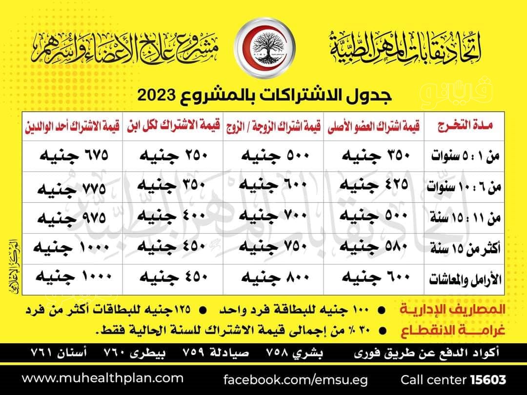 أسعار الاشتراك في مشروع علاج أعضاء اتحاد المهن الطبية وأسرهم