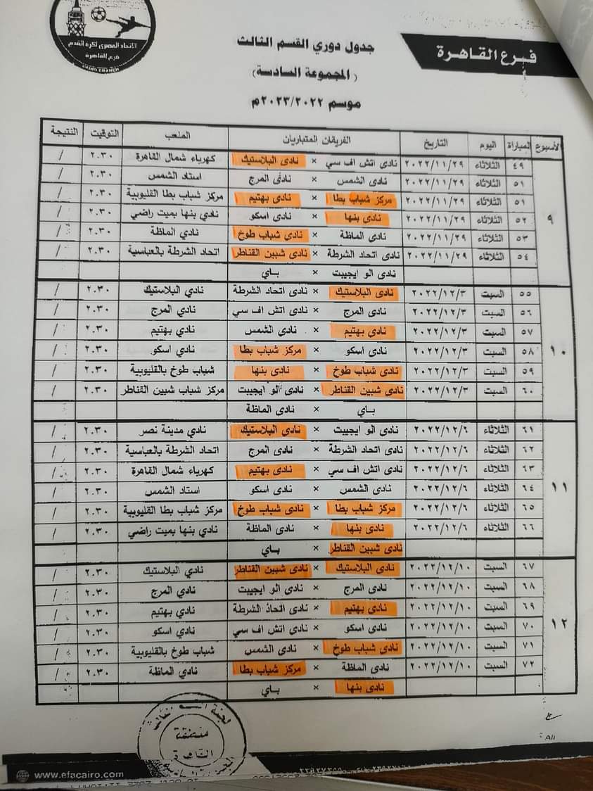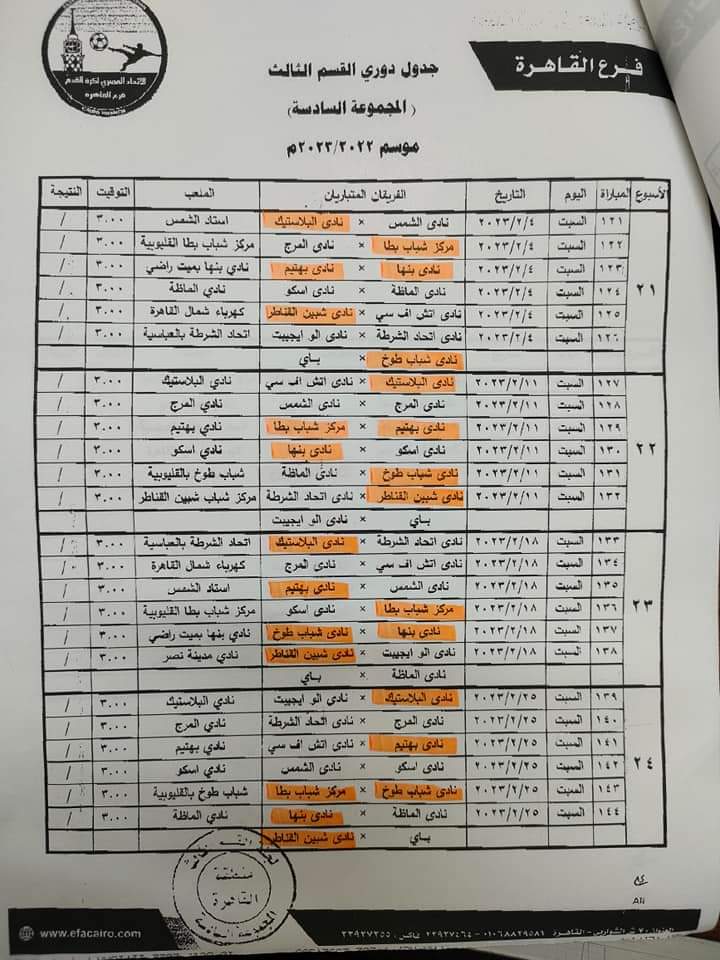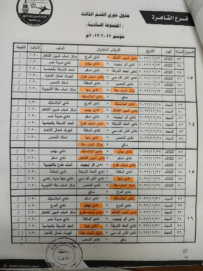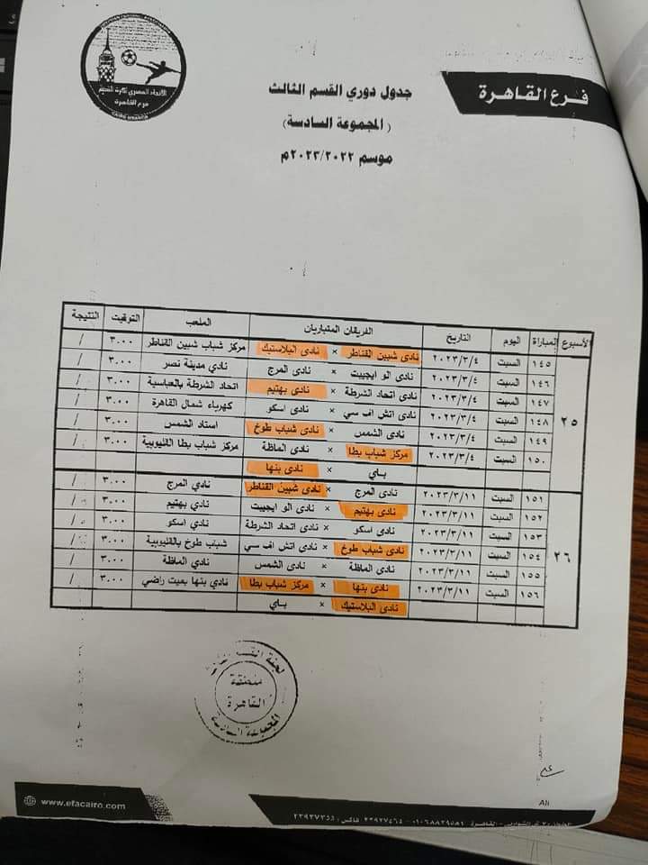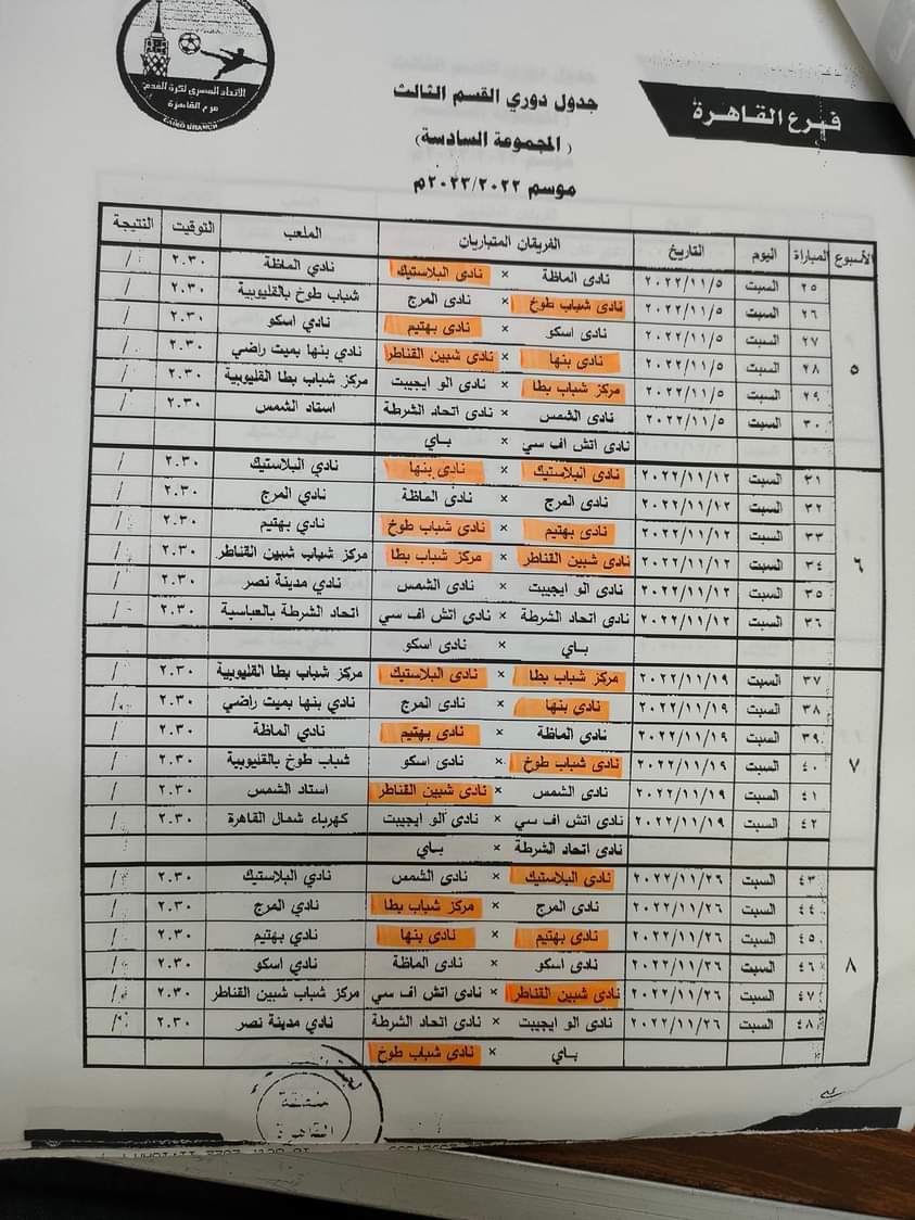 جدول دوري القسم الثالث بمجموعة القاهرة موسم 2022-2023