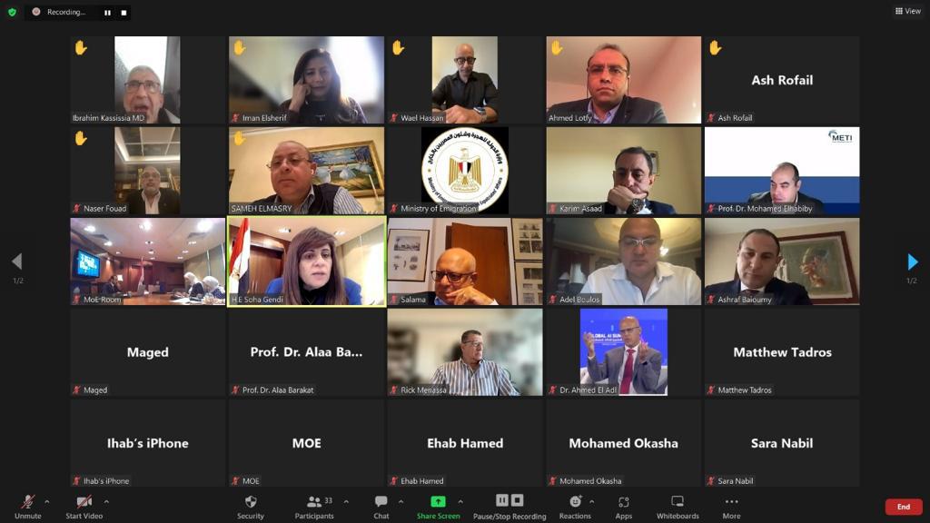 عقدت السفيرة سها جندي، وزيرة الدولة للهجرة وشئون المصريين بالخارج، لقاءً افتراضيًا عبر "الفيديوكونفرانس"، ضم ٤٠ من المستثمرين وخبراء الاقتصاد والاستثمار المصريين بالخارج من نحو ١٢ دولة حول العالم، وذلك لبحث رؤيتهم لإنشاء وتأسيس شركة استثمارية للمصريين بالخارج، بعد موافقة دولة رئيس مجلس الوزراء على البدء في التنفيذ، جاء اللقاء بحضور د. صابر سليمان، مساعد وزيرة الهجرة للتطوير المؤسسي والمصريين بالخارج، والأستاذ وسيم زكي المستشار المالي لوزارة الهجرة.