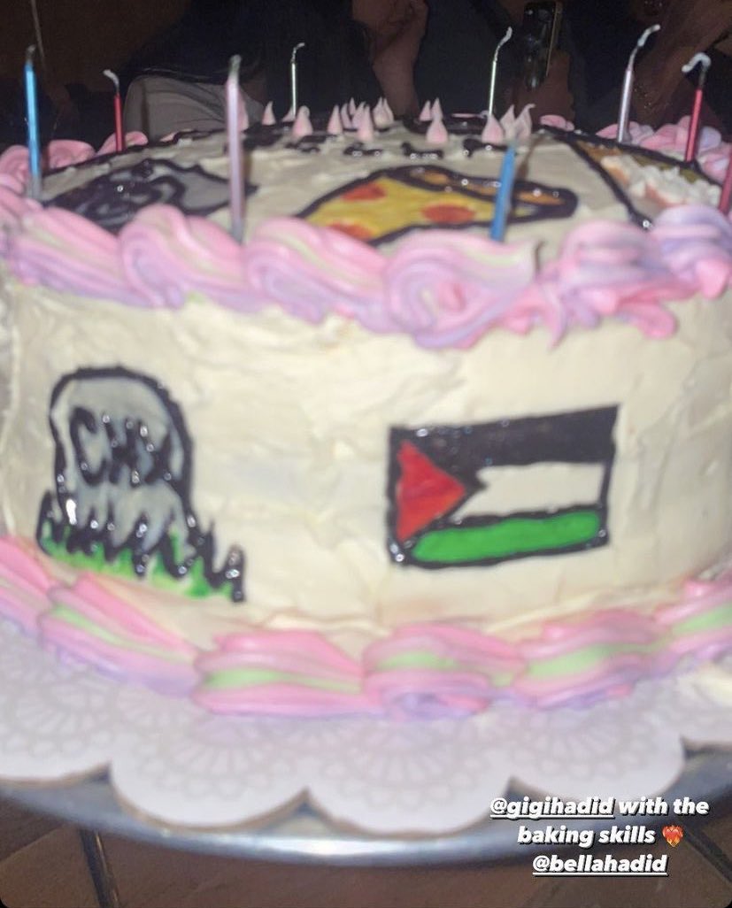 احتفلت عارضة الأزياء الأمريكية الجنسية الفلسطينية الأصل بيلا حديد، بعيد ميلادها ٢٦، بتورتة من صنع شقيقتها جيجي حديد، وحملت كعكة عيد الميلاد، صورة لعلم دولة فلسطين المحتلة، والتي تعتز بيلا حديد بانتمائها لها، ودائما ما تدافع عنها.