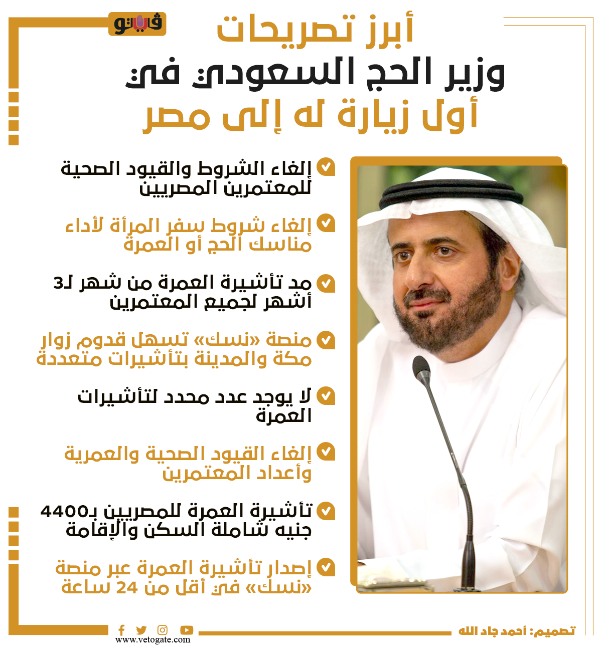 أبرز تصريحات وزير الحج السعودي في أول زيارة له إلى مصر | إنفوجراف الثلاثاء 11/أكتوبر/2022 - 01:46 م 10/11/2022 1:46:04 PM شارك طباعة 18 حجم الخط شارك طباعة