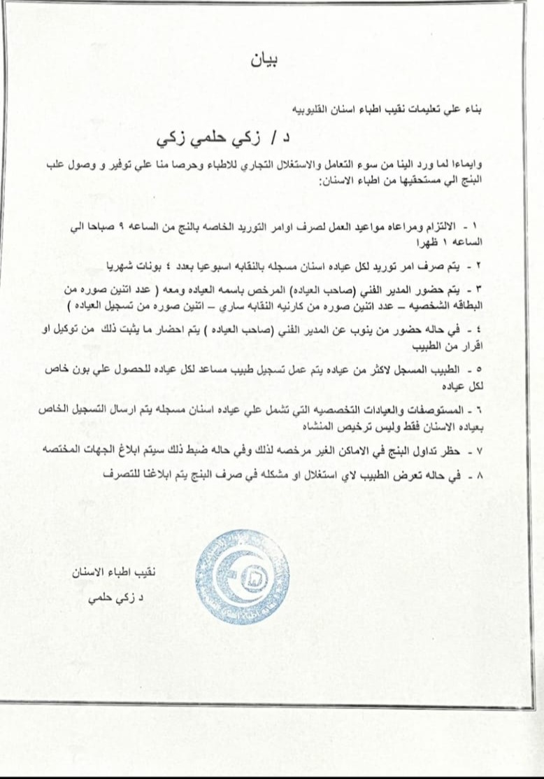 وأوضح الدكتور أحمد شوقي أمين صندوق نقابة الأسنان بالقليوبية أن أعضاء مجلس النقابة والجمعية العمومية فوجئوا بصدور قرار منفرد من نقيب الأسنان بالقليوبية بتخفيض حصة الأطباء المدعمة من 8 عبوات مخدر بمعدل عبوتان أسبوعيا إلى 4 عبوات شهريا بمعدل عبوة كل أسبوع حيث أن تلك العبوات الـ 7 والتي كانت تصرف حتى أكتوبر الجاري معمول بها قرار من هيئة الشراء الموحد ونقابة أطباء الأسنان العامة وتعطي لكل طبيب أسنان في كافة نقابات أطباء الأسنان الفرعية منذ سنوات بشكل مدعم وثابت لكل طبيب.