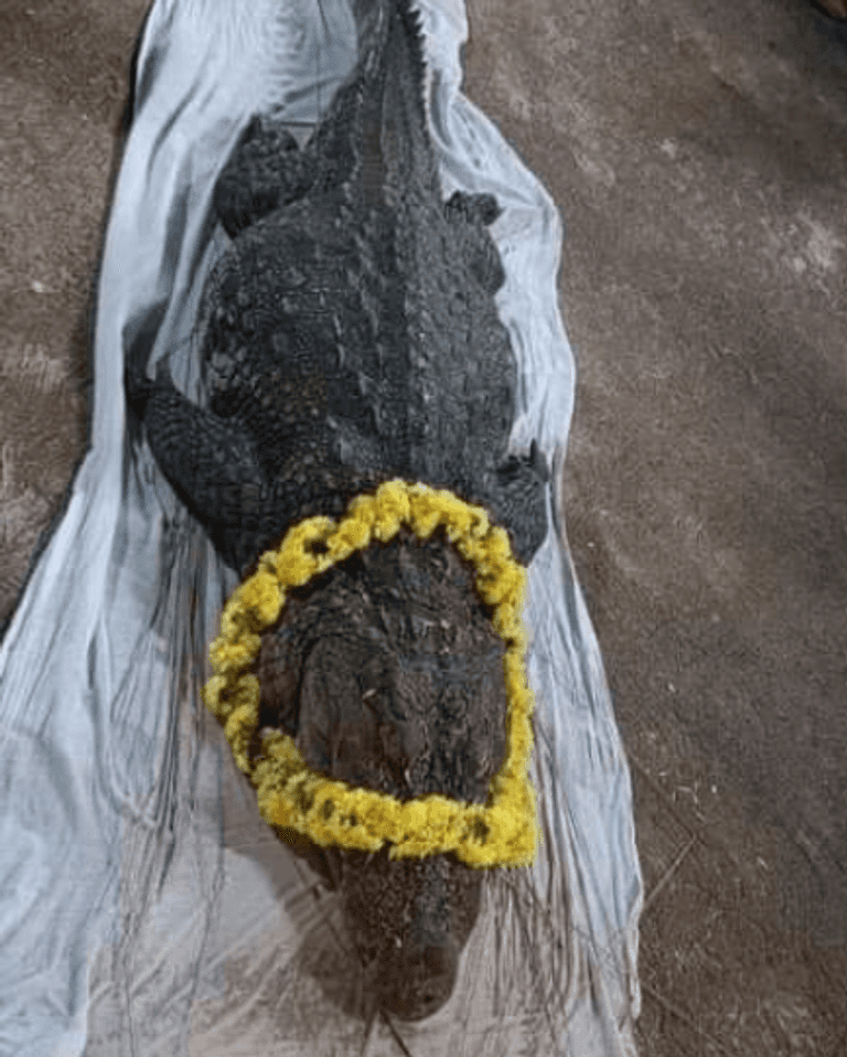 لم تهاجم إنسانا.. جنازة مهيبة لتمساحة نباتية في الهند