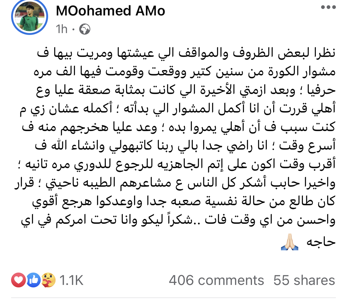 وكتب أمو عبر صفحته الشخصية عبر موقع التواصل الاجتماعي فيس بوك: نظرا لبعض الظروف والمواقف الي عشتها ومريت بيها ف مشوار الكورة من سنين كتير ووقعت وقومت فيها ألف مرة حرفيا ؛ وبعد ازمتي الأخيرة الي كانت بمثابة صاعقة عليا وع أهلي قررت أن انا أكمل المشوار اللي بدأته ؛ أكمله عشان زي م كنت سبب ف أن أهلي يمروا بده ؛ وعد عليا هخرجهم منه ف أسرع وقت ؛ انا راضي جدا باللي ربنا كاتبهولي وإنشاء الله ف أقرب وقت أكون على أتم الجاهزيه للرجوع للدوري مرة تانية ؛ واخيرا حابب أشكر كل الناس ع مشاعرهم الطيبه ناحيتي ؛ قرار كان طالع من حالة نفسية صعبة جدا واوعدكوا هرجع أقوي واحسن من اي وقت فات..شكرًا ليكو وانا تحت امركم في اي حاجه