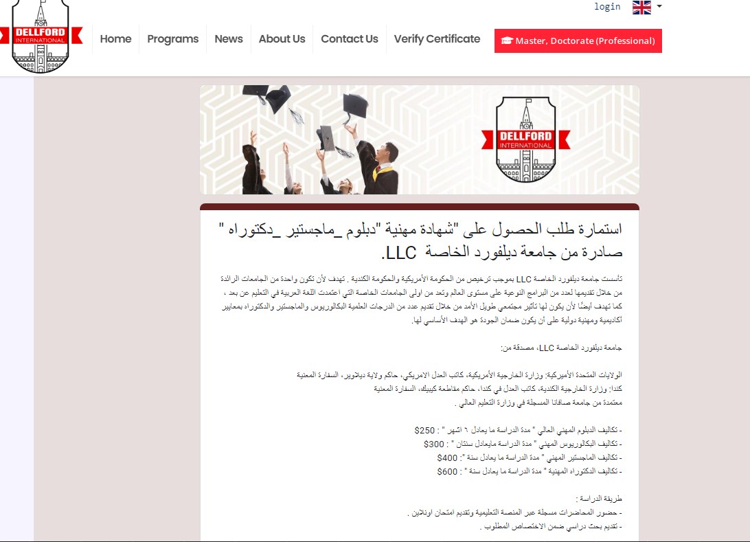 تبين بالبحث على موقع جامعة ديلفورد الأمريكية الخاصة، أنها عبارة عن شركة وليست جامعة رسمية على غرار الجامعات الأمريكية العريقة، وتخدع زبائنها من خلال الدراسة عن بعد ومنح شهادات علمية مختلفة ما بين الماجستير والدكتوراة نظير الأموال.
