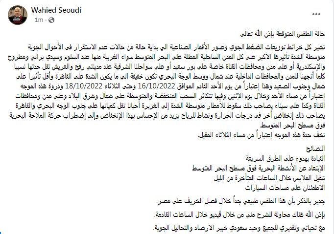 وكتب وحيد سعودي تدوينة على الفيس بوك: "حالة الطقس المتوقعة بإذن الله تعالى.. تشير كل خرائط توزيعات الضغط الجوي وصور الأقمار الصناعية إلى بداية حالة من حالات عدم الاستقرار فى الأحوال الجوية متوسطة الشدة"