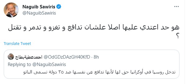 وكتب ساويرس على تويتر: "هو حد اعتدى عليها أصلا علشان تدافع وتغزو وتدمر وتقتل؟".