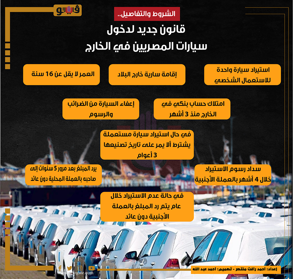 الشروط والتفاصيل.. قانون جديد لدخول سيارات المصريين في الخارج | إنفوجراف الأربعاء 12/أكتوبر/2022 - 08:20 م 10/12/2022 8:20:15 PM أحمد رأفت منتصر شارك طباعة 18 حجم الخط شارك طباعة المصريين في الخارج استيراد سيارة للمصريين في الخارج اخر قرارات مجلس الوزراء اليوم