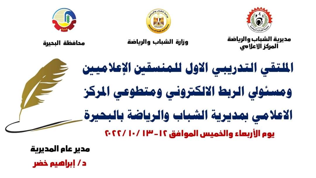 تنظم مديرية الشباب والرياضة بالبحيرة الملتقي التدريبي الأول لمسؤولي ومتطوعي المركز الإعلامي بالبحيرة عن كيفية صياغة الخبر ومهارات إنشاء المحتوى والتصوير والمونتاج بشكل احترافي على الموبايل وكيفية التعامل مع وسائل لتواصل الاجتماعي الحديثة وذلك بقاعة حمام السباحة بنادي ألعاب دمنهور يومي الأربعاء والخميس الموافق 12 و13 أكتوبر 2022م.