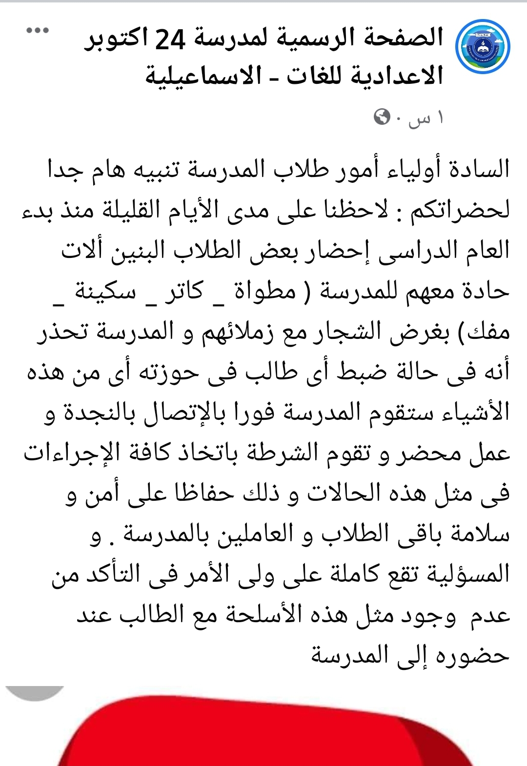 حذرت مدرسة 24 أكتوبر الإعدادية الرسمية لغات بالإسماعيلية، طلابها من حمل الأدوات والآلات الحادة مثل " الكتر، ومطواة، سكينة، مفك " وذلك عقب ملاحظة إدارة المدرسة لسلوك مجموعة من الطلاب حيث يقومون بإحضار كميات من تلك الأدوات والآلات الحادة معهم لاستخدامها في الشجار مع زملائهم.