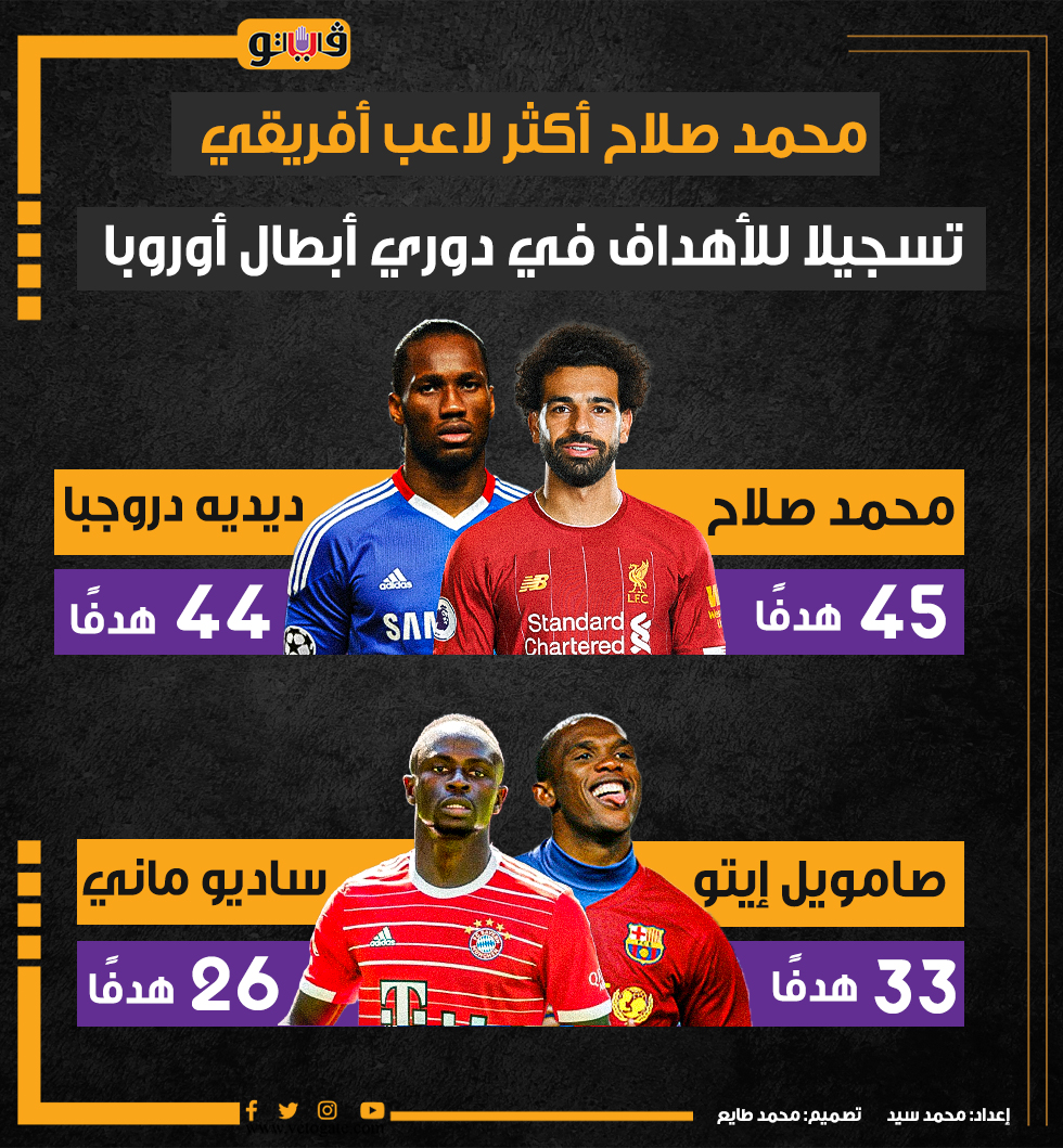محمد صلاح أكثر لاعب أفريقي تسجيلا للأهداف في دوري أبطال أوروبا|إنفوجراف الخميس 13/أكتوبر/2022 - 12:06 ص 10/13/2022 12:06:15 AM محمد صلاح محمد سيد شارك طباعة 18 حجم الخط شارك طباعة صامويل إيتو ديديه دروجبا دوري ابطال اوروبا محمد صلاح ساديو ماني