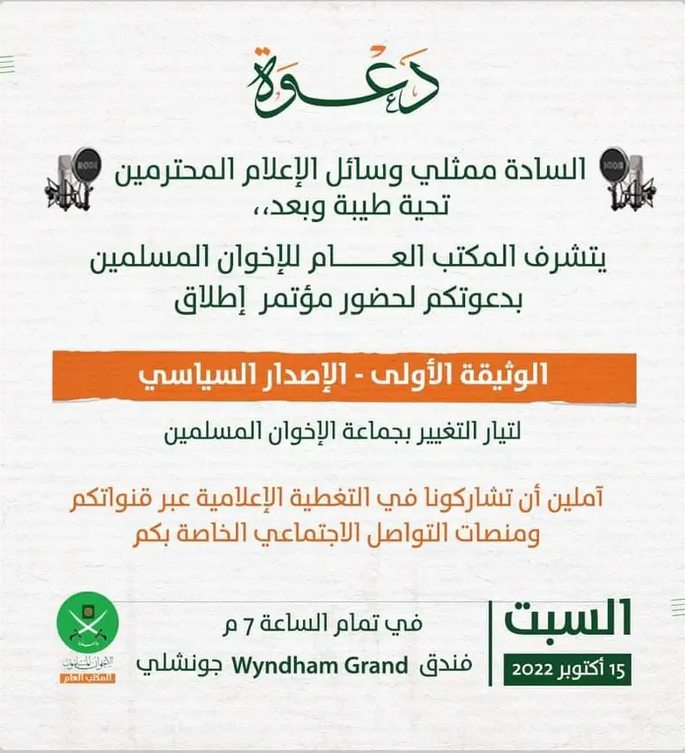كما دعا إلى مؤتمر عام في تركيا بعد غد السبت، تحت شعار "على عهد الشهيد" للإعلان عن نفسه، وإصدار ما يعرف بـ"الوثيقة السياسية".