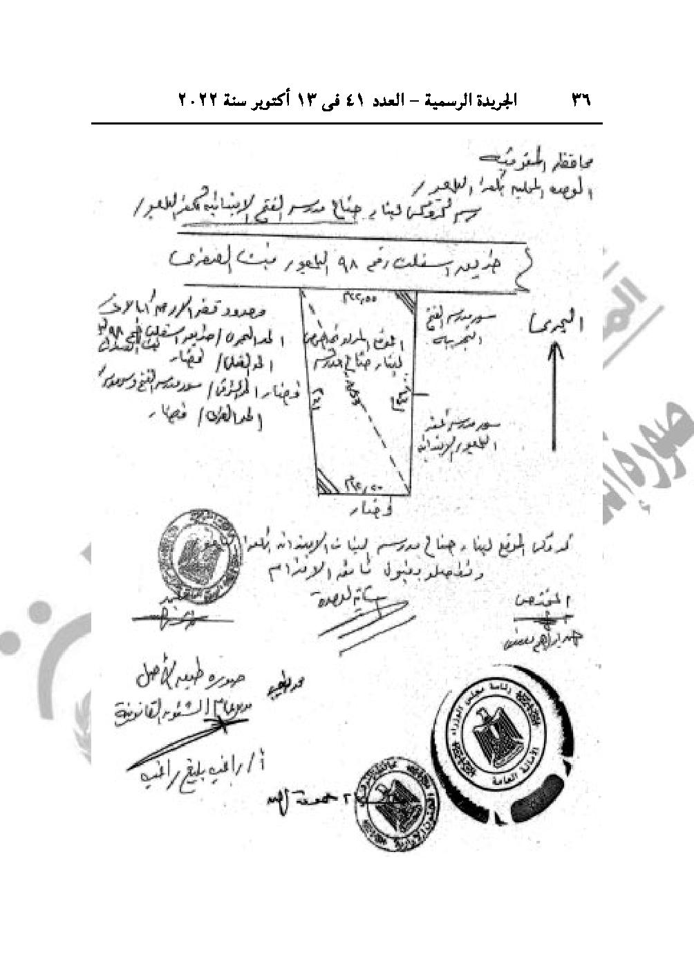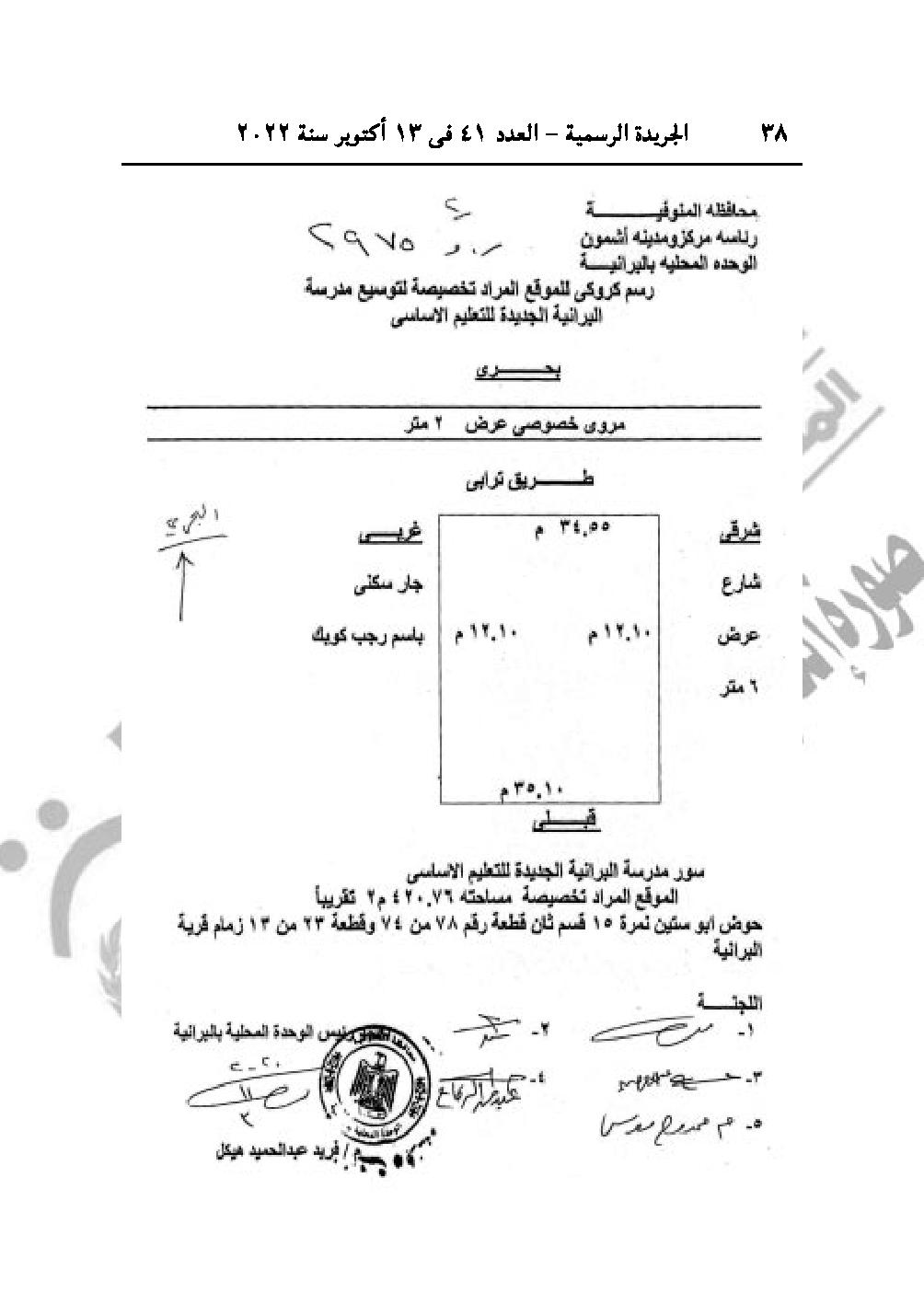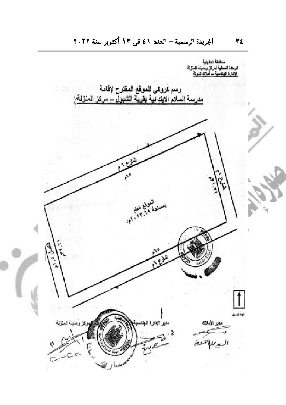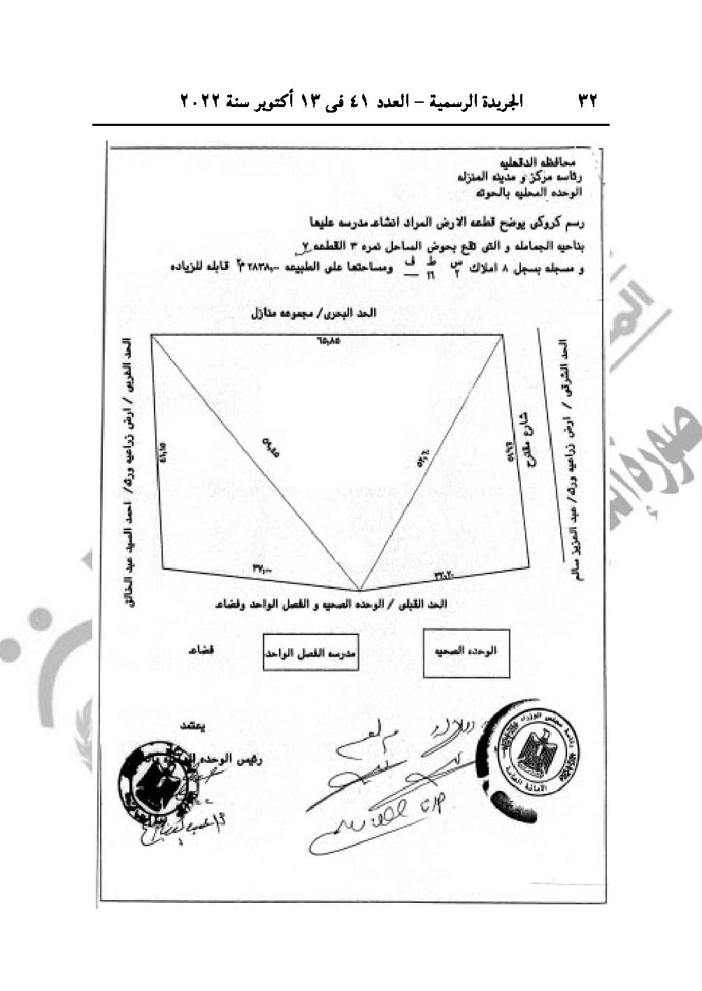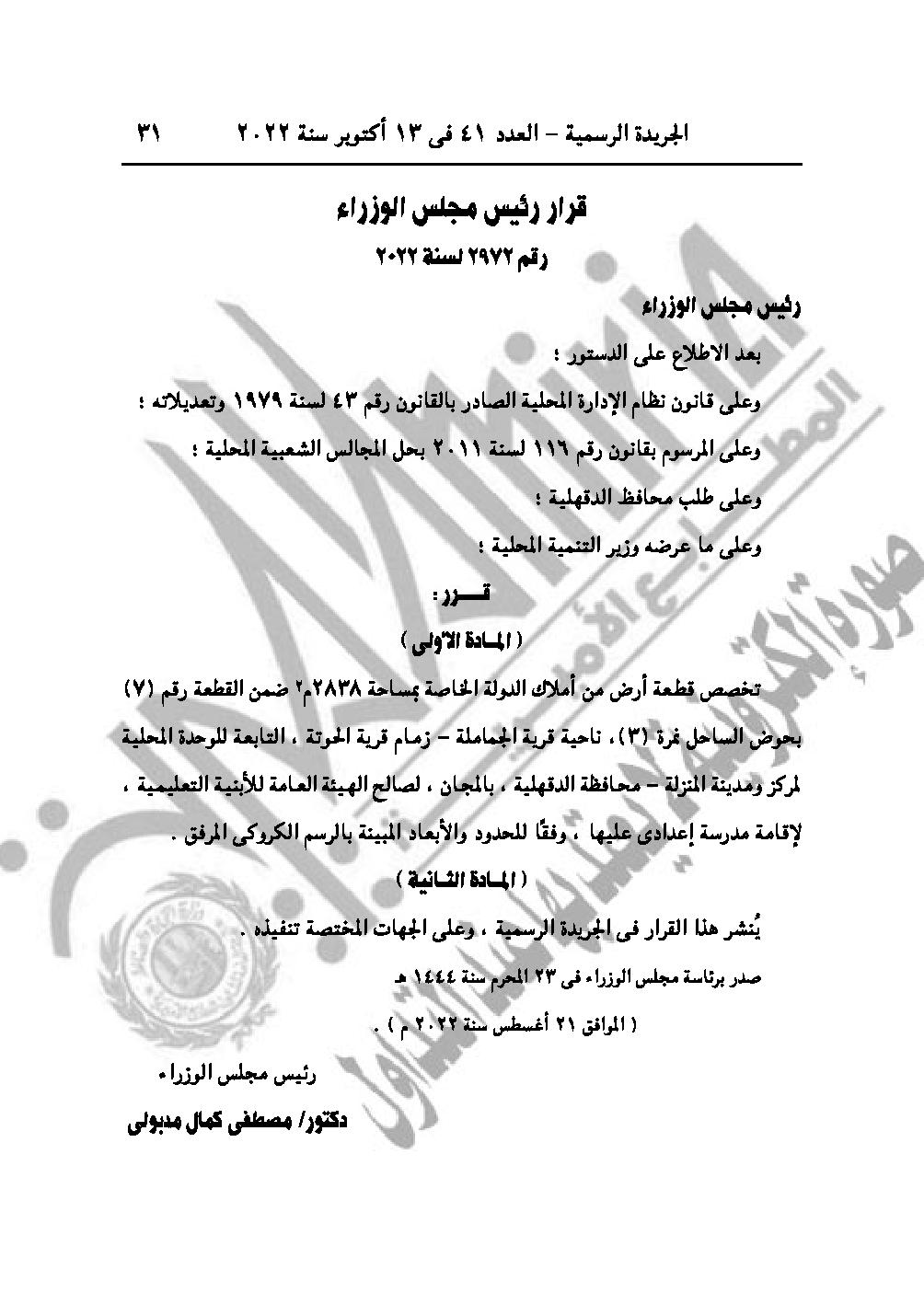 - والقرار رقم 2972 لسنة 2022، بتخصيص قطعة أرض من أملاك الدولة الخاصة بمساحة 2838 متر مربع، ناحية قرية الجماملة زمام قرية الحوته، التابعة للوحدة المحلية لمركز ومدينة المنزلة محافظة الدقهلية، بالمجان، لإقامة مدرسة إعدادية.