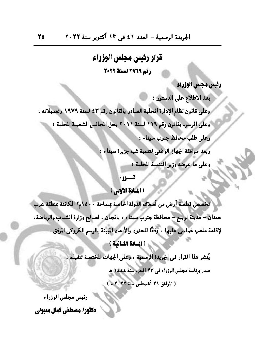 - القرار رقم 2969 لسنة 2022، بتخصيص قطعة أرض من أملاك الدولة الخاصة بمساحة 1500 متر مربع، بمنطقة عرب حمدان، مدينة نويبع، محافظة جنوب سيناء، بالمجان، لإقامة ملعب خماسي عليها.
