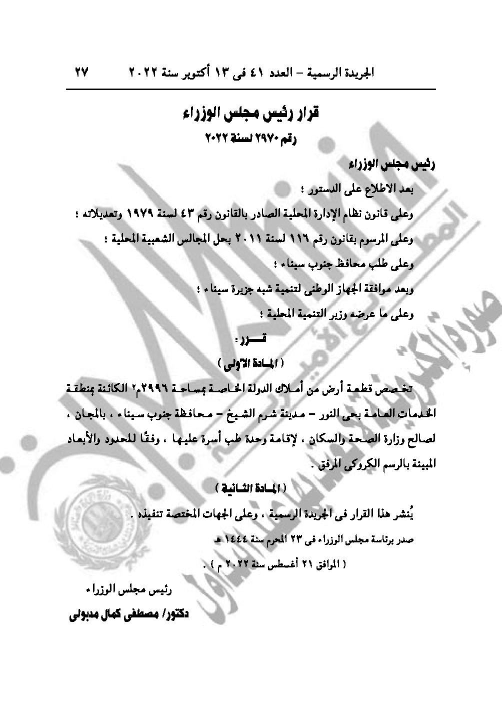 - والقرار رقم 2970 لسنة 2022، بتخصيص قطعة أرض من أملاك الدولة الخاصة بمساحة 2996 متر مربع، بمنطقة الخدمات العامة بحي النور مدينة شرم الشيخ بمحافظة جنوب سيناء، بالمجان، لإقامة وحدة طب أسرة.