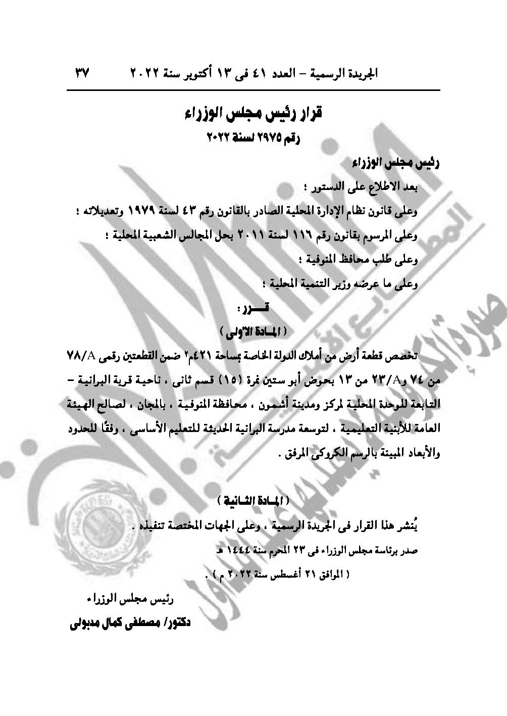 - والقرار رقم 2975 لسنة 2022، بتخصيص قطعة أرض من أملاك الدولة الخاصة بمساحة 421 متر مربع، ناحية قرية البرانية، التابعة للوحدة المحلية لمركز ومدينة أشمون، محافظة المنوفية، بالمجان، لتوسعة مدرسة البرانية الحديثة للتعليم الأساسي.