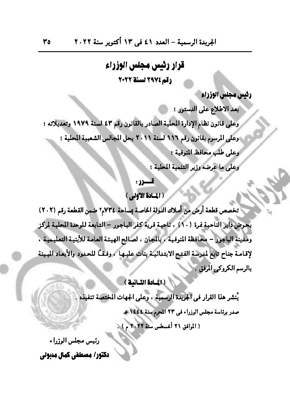 - والقرار رقم 2974 لسنة 2022، بتخصيص قطعة أرض من أملاك الدولة الخاصة بمساحة 734 متر مربع، ناحية قرية كفر الباجور، التابعة للوحدة المحلية لمركز ومدينة الباجور، محافظة المنوفية، بالمجان، لإقامة جناح تابع لمدرسة الفتح الابتدائية بنات.